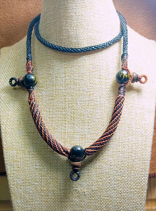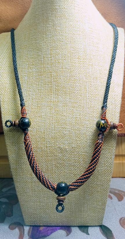 สร้อยคอเชือกเทียน งานถักมือ ( สีดำ-แซมน้ำตาล + แซมลูกปัดโอม ห้อยพระ 3 องค์ ) ยาว26นิ้ว ครับ