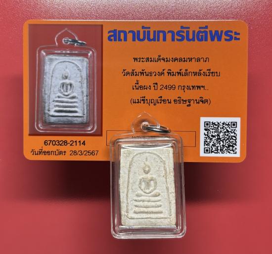 พระสมเด็จมงคลมหาลาภ วัดสัมพันธวงศ์ พิมพ์เล็ก หลังเรียบ เนื้อผง ปี 2499 คุณแม่บุญเรือน อธิษฐานจิต พร้อมเลี่ยม พร้อมบัตรรับรอง |