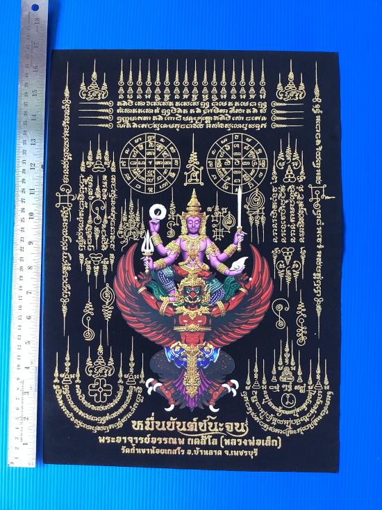 ผ้ายันต์ พระนารายณ์ทรงสุบรรณ หมื่นยันต์ชนะจน พระอาจารย์อรรณพ(อาจารย์เล็ก) วัดถ้ำเขาน้อย จ.เพชรบุรี ผ้ากำมะหยี่สีดำ ขนาด A3 (11.5 นิ้วx 16.6 นิ้ว) |