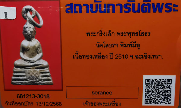 พระกริ่งเล็กพระพุทธโสธร วัดโสธรฯ พิมพ์มีหู เนื้อทองเหลือง กริ่งดัง ห่วงเดิม ปี2510 จ.ฉะเชิงเทรา + บัตรG-pra สภาพเดิมค่ะ |