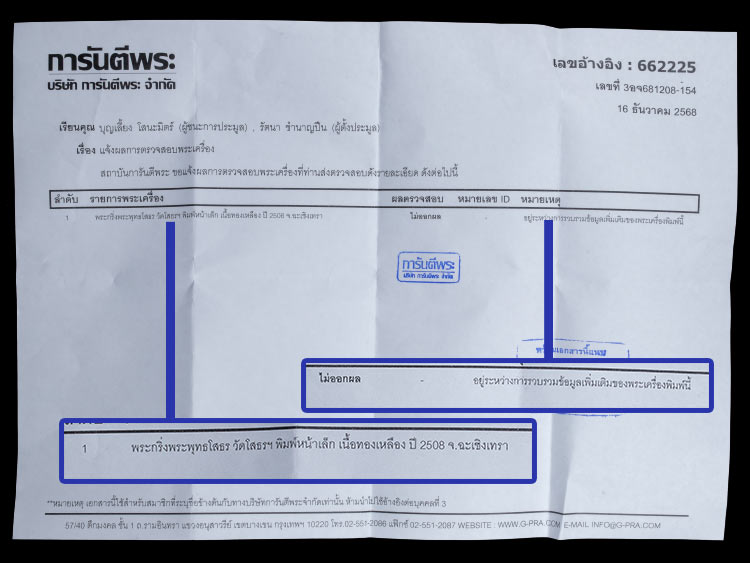 รายการนี้ผมเคยส่งออกบัตรมาแล้วครับ ผลออก(ไม่สรุปผล)เนื่องจากอยู่ระหว่างการรวบรวมข้อมูลเพิ่มเติมของพระเครื่องพิมพ์นี้