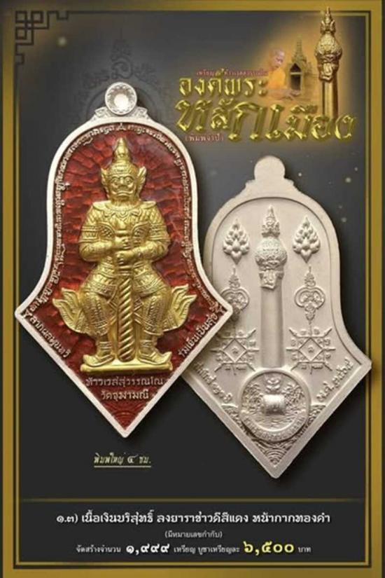 เหรียญจำปี องค์พระหลักเมือง สมโภช 121 ปี หลวงพ่ออิฏฐ์ วัดจุฬามณี เนื้อเงินลงยาราชาวดีสีแดง หน้ากากทองคำ พิมพ์ใหญ่ ซีสเดิม(ลุ้นเลข)