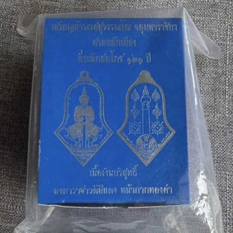 เหรียญจำปี องค์พระหลักเมือง สมโภช 121 ปี หลวงพ่ออิฏฐ์ วัดจุฬามณี เนื้อเงินลงยาราชาวดีสีแดง หน้ากากทองคำ