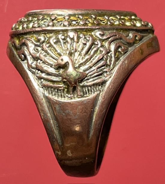 แหวนเนื้อ 3 กษัตริย์ งานช่างแกะสั่งทำ หัวแหวนติดเหรียญหล่อรูปหยดน้ำ หลวงพ่อวัดไร่ขิง นครปฐม ปี2543 เนื้อ 3 กษัตริย์ฝังพลอยรอบวง ขนาดนิ้วผู้ชาย |
