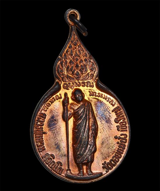 เหรียญยืนถือไม้เท้า รุ่นรวมใจ ( 5 แชะ ) หลวงปู่แหวน วัดดอยแม่ปั๋ง จ.เชียงใหม่ ปี 2518 |
