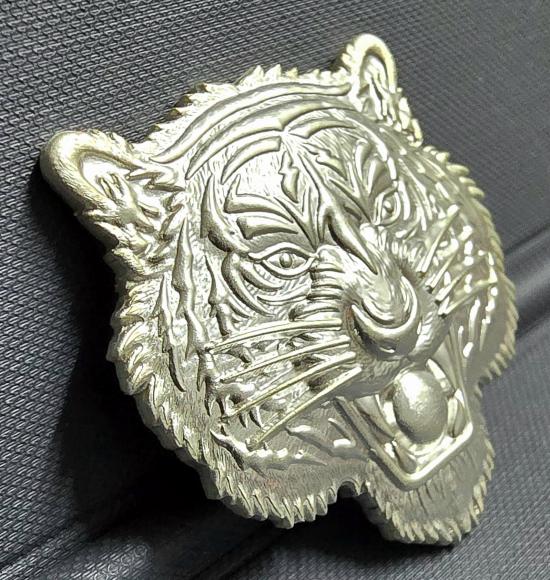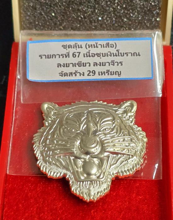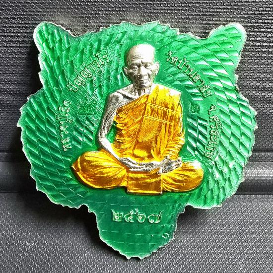เหรียญหน้าเสือ เนื้อชุบเงินโบราณ หลังหลวงปู่นั่งสมาธิ ลงยาเขียว ลงยาจีวร