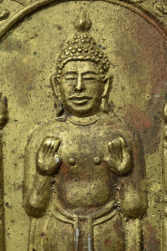 เหรียญ ปางห้ามสมุทร หลังยันต์ ((หลวงพ่อเงิน วัดดอนยายหอม ปลุกเสก)) เนื้อทองเหลืองฝาบาตร |