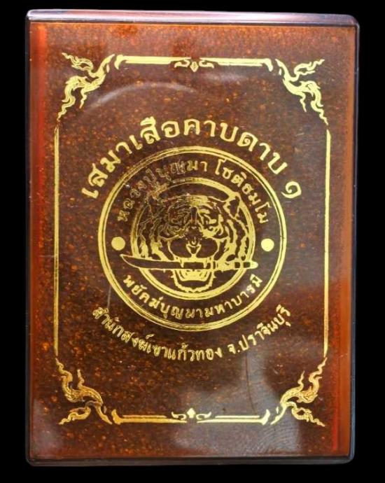 เหรียญเสมาเสือคาบดาบ 1 พยัคฆ์บุญมา มหาบารมี หลวงปู่บุญมา สำนักสงฆ์เขาแก้วทอง เนื้อทองแดงซาติน ลงยาขอบน้ำเงิน บนน้ำเงิน+จีวร (หลังเสือคู่) หมายเลข 33 |
