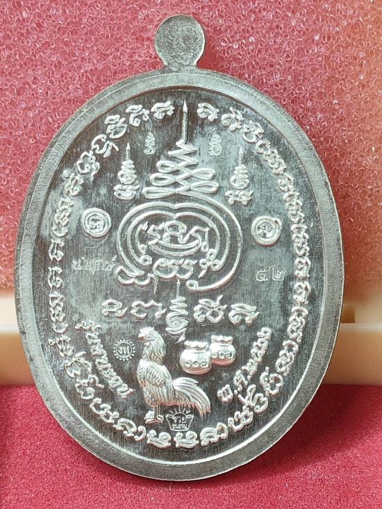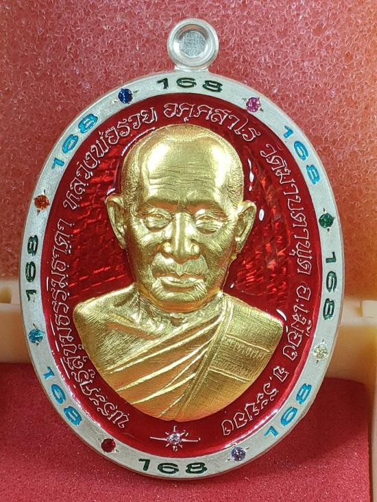 เหรียญชนะจน ชุดนำฤกษ์ หลวงพ่อรวย วัดมาบตาพุด เนื้อเงินหน้ากากทองคำ ลงยาพื้นแดงฝังพลอยนพเก้า เลข42 พระสวย กล่องครบ ( จัดสร้างเพียง 100 เหรียญ)