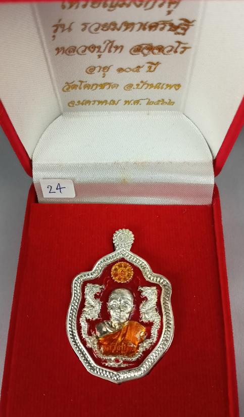 เหรียญมังกรคู่ รุ่น รวยมหาเศรษฐี หลวงปู่ไท สัจฺจวโร (อายุ ๑๐๕ ปี) วัดโคกชาด จ.นครพนม เนื้อเงินลงยาสีแดง เบอร์ 24 พร้อมกล่องครับ (น้ำหนักเหรียญ 18.73 กรัม)
