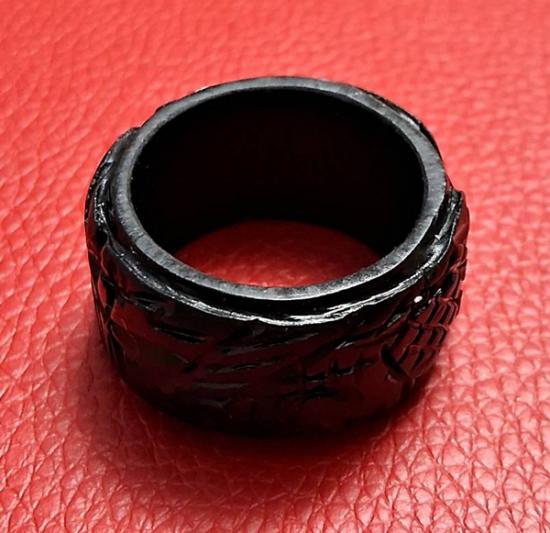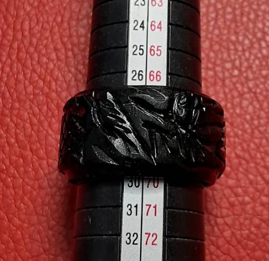 แหวนหยกดำแกะลายมังกร หยกพม่าแท้ 100 % (แสงส่องผ่าน) เส้นผ่าศูนย์กลาง 2.3 ซม. หนา 1.4 ซม. หายากวงใหญ่ๆ ไม่ค่อยได้มาบ่อย ราคาค่อนข้างสูง (กท.54)