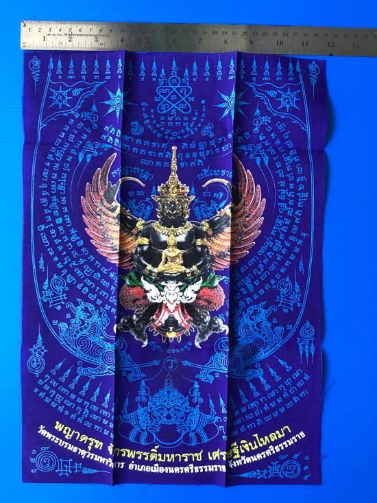 ผ้ายันต์ พญาครุฑ รุ่น เศรษฐีเงินไหลมา วัดพระศรีมหาธาตุวรมหาวิหาร จ.นครศรีธรรมราช สีน้ำเงิน ขนาด A3 ขนาด 11.5 นิ้ว x 16.5 นิ้ว |