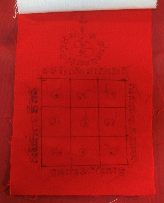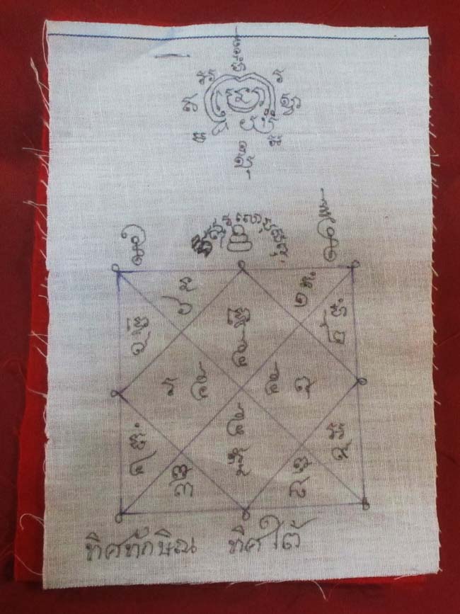 ผ้ายันต์ ไม่ทราบที่ จารยันต์ด้วยมือ ที่ผ้ายันต์เขียน "ทิศทักษิณ ทิศใต้" ครับ (พระบ้าน ครับ) |