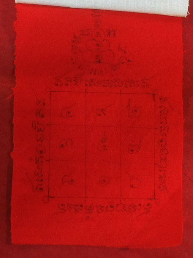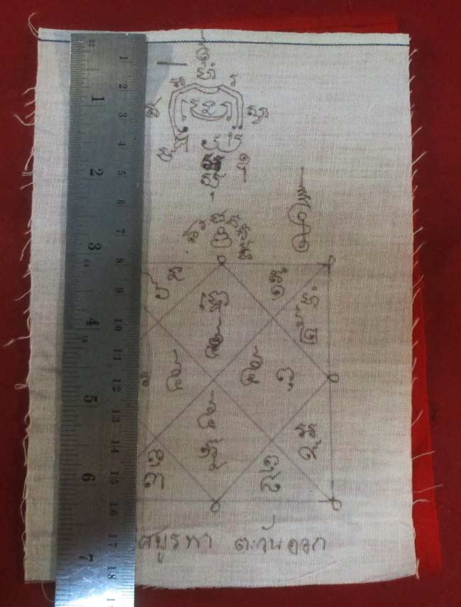 ผ้ายันต์ ไม่ทราบที่ จารยันต์ด้วยมือ ที่ผ้ายันต์เขียน "ทิศบูรพา ตะวันออก" ครับ (พระบ้าน ครับ) |