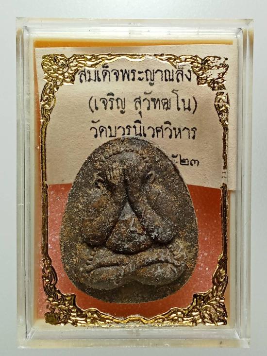 พระปิดตายันต์ดวงเล็ก หรือยันต์ดวงสุกิตติมา เนื้อผงใบลานดำ ตังอิ๊วประทุ สอดตะกรุดเงิน สมเด็จพระญาณสังวร(เจริญ สุวัฑฒโน ปธ.๙) พิธีพุทธาภิเษก ณ พระอุโบสถคณะรังสี วัดบวรนิเวศวิหาร ๒ ตุลาคม ๒๕๒๓ หลวงปู่โต๊ะ วัดประดู่ฉิมพลี ร่วมปลุกเสก สมเด็จพระญาณสังวรฯทรงจุดเทียนชัยและประธานอธิษฐานจิต พร้อมด้วยพระคณาจารย์แห่งยุคอีกหลายรูป มีกล่องเดิมพร้อมใบฝอย เคาะเดียว