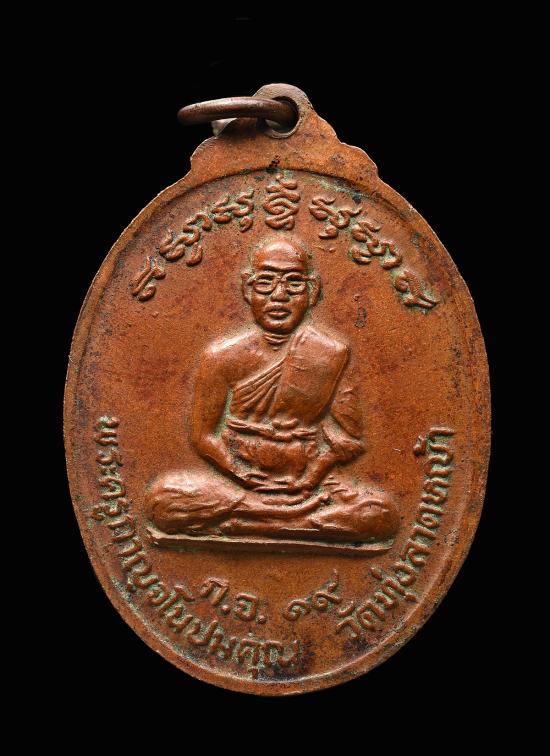 เหรียญปัญจะเกจิรุ่นแรก หลวงพ่อลำใย วัดทุ่งลาดหญ้า จ.กาญจนบุรี ปี 2519 ด้านหน้าเหรียญเป็นรูปหลวงพ่อยิ้ม , หลวงพ่อเหรียญ วัดหนองบัว , หลวงพ่อเปลี่ยน วัดใต้ และหลวงพ่อสอน วัดทุ่งลาดหญ้า ซึ่งเป็นครูบาอาจารย์ที่หลวงพ่อลำใยท่านให้ความเคารพนับถือ ส่วนด้านหลังเหรียญเป็นรูปหลวงพ่อลำใยนั่งเต็มองค์ เนื้อทองแดง |