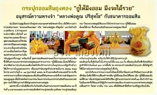 ++วัตถุประสงค์ : ได้รับความเมตตาจาก หลวงพ่อคูณ มอบคาถา มหารวย " กูให้มึงออม มึงจะได้ไม่จน " นำมาจัดทำตราประทับลงบนผลิตภัณฑ์ หรือบริการทางการเงินทุกประเภทที่ลูกค้าเข้ามาใช้บริการ ภายในของธนาคาร เพื่อมอบกำลังแก่ลูกค้า ซึ่งพร คาถามหารวยนี้ หลวงพ่อคูณ มอบเพื่อเตือนสติให้ทุกคนตระหนักถึงความสำคัญของการออมอยู่เสมอ โดยตราประทับ แกะจากลายมือจริงของ หลวงพ่อคูณ รวมทั้งได้ผ่านการทำพิธีปลุกเสกจาก หลวงพ่อคูณ ในวันคล้ายวันสถาปนาธนาคารออมสิน ครบ 94 ปี วันที่ 1 เมษายน พ.ศ.2550 ธนาคารออมสิน จัดทำกระปุกออมสิน รุ่น พิเศษกระปุกออมสินถุงทอง โดยหลวงพ่อคูณได้เมตตาให้นำคาถามหารวยกูให้มึงออมมึงจะได้รวย ซึ่งเป็นลายมือจริงของหลวงพ่อคูณมาพิมพ์ลงในกระปุกออมสิน จำนวน 600,000 ใบ |
