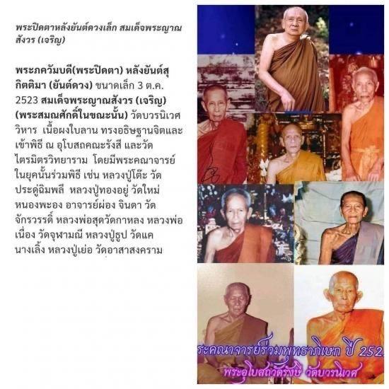 พระปิดตายันต์ดวงเล็ก ปี2523 สมเด็จพระญาณสังวร (เจริญ) วัดบวรนิเวศวิหาร ทรงอธิษฐานจิตและเข้าพิธี ณ อุโบสถคณะรังสีและวัดไตรมิตรวิทยาราม โดยมีพระคณาจารย์ในยุคนั้นร่วมพิธี เช่น