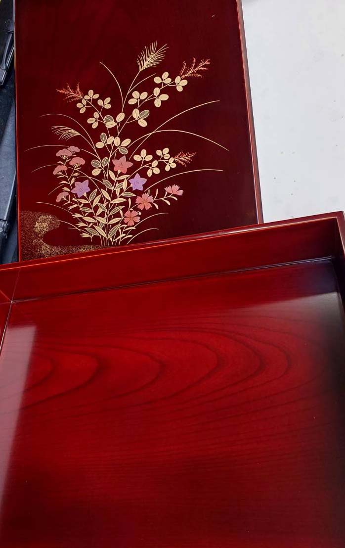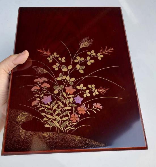 รายละเอียด ***วัดใจ***กล่องไม้เแลคเกอร์ญี่ปุ่นสีแดงเข้มวินเทจตกแต่งลายทอง หญ้าและดอกไม้ในฤดูใบไม้ร่วง ขนาด 12 X 9 นิ้ว สูง 2.5 นิ้ว