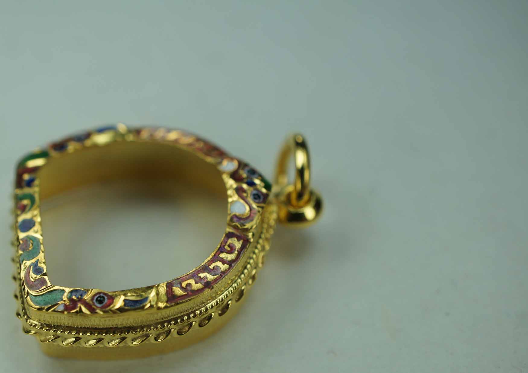 กรอบทอง ลงยาล้อม ยกซุ้ม หัวสิงห์ ข้างเกลียวโปเต้ 3 เส้น แกะลายทั้งใบ ใส่พระปิดตาปุ้มปุ้ย *** หลวงปู่ทิม วัดละหารไร่ ***หรือขนาดไกล้เคียง ขนาดกว้างจากขอบใน *** สูง 1.4 กว้างจากฐาน 1 ซม. *** งานขึ้นมือ |