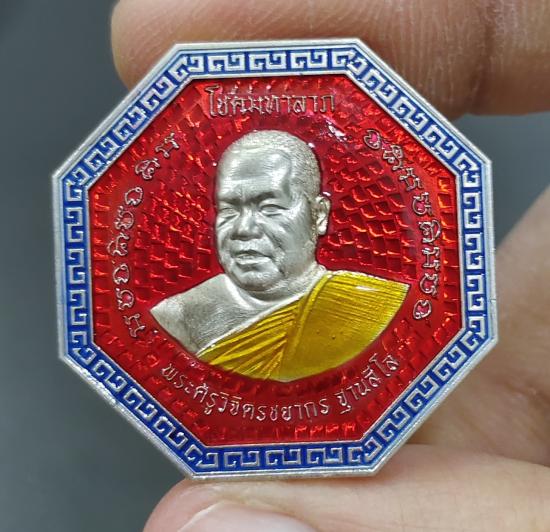 เหรียญยี่กอฮง โชคมหาลาภ โชคมหาเฮง (เนื้อเงิน ลงยาสีแดง) พระอาจารย์จิ๊ วัดธรรมิกาวาส (คังคาว)
