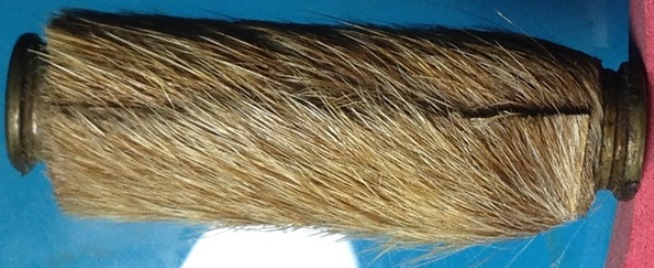 ตะกรุดปลอกลูกปืน หุ้มหนังเสือ ขยาดยาว 2 นิ้วฟุต ไม่ทราบเกจิ