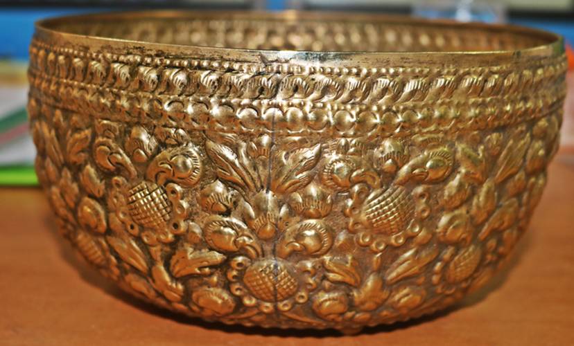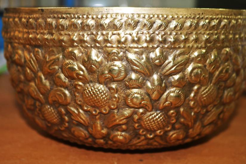 วัดใจเคาะเดียว////ขันทองเหลืองแกะลายงานเก่าๆ ปากกว้าง 8.7 นิ้ว สูง 4.8 นิ้ว