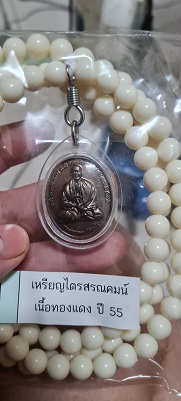 เหรียญไตรสรณคมน์ เนื้อทองแดง หลวงตาม้า วัดถ้ำเมืองนะ พร้อมรอยจารหลวงตาม้า เลี่ยมจากวัดพร้อมประคำ