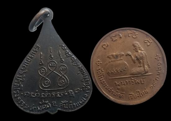 พร้อมกันทีเดียว 2เหรียญครับ เหรียญพระพุทธครบรอบ 36 ปี วัดโรงธรรมสามัคคี อ.สันกำแพง จ.เชียงใหม่ พ.ศ.2517 + เหรียญขวัญถุงพูนทรัพย์ หลังเเม่นางกวัก เนื้อทองแดง ปี2521