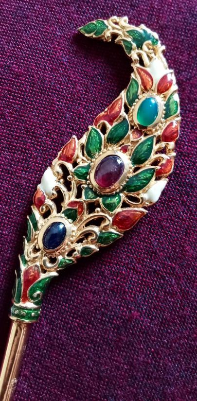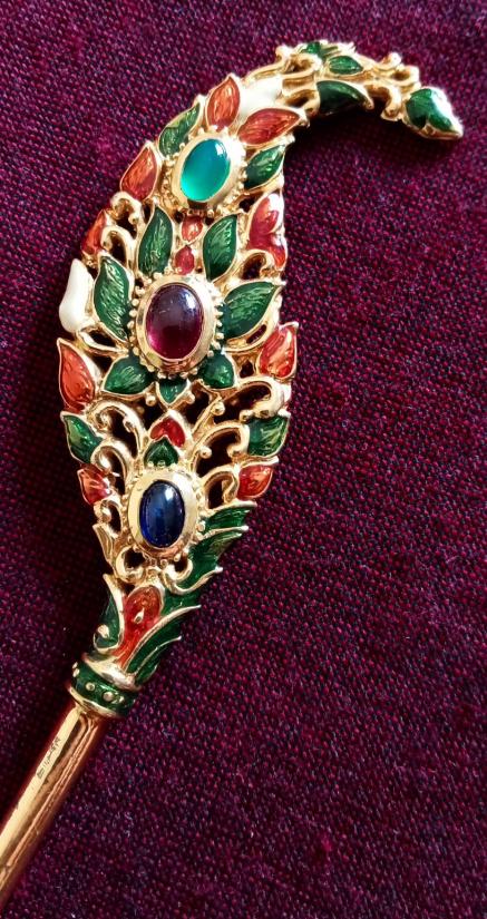 ปิ่นเจ้าฟ้า เนื้อเงินเปียกทองคำ ทรงแซ่จามรี ฝังพลอยแท้ 6 เม็ด ลงยาราชาวดีเบญจรงค์ หนักประมาณ 24 กรัม ยาวประมาณ 16 เซ็นต์ สภาพสวย ไม่ผ่านการใช้ ตามรูป มีรอยขีดข่วนที่หางปิ่นบ้าง เนื่องจากการเก็บ งานเก่างดงาม ส่งฟรีทั่วไทย รับประกันตามกฎครับ