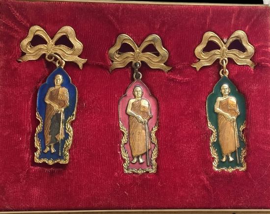 ครบชุด 3 เหรียญ กล่องเดิม หายากมากๆครับ เหรียญหลวงพ่อบุญเย็นพิมพ์ยืนรุ่นแรกชุดกรรมการปี2521 รุ่นสร้างสะพาน เนื้อกะไหล่ทองลงยามีโบว์ หลวงพ่อบุญเย็น ฐานธัมโม สำนักเจ้าพรหมมหาราช อ.ฝาง จ.เชียงใหม่