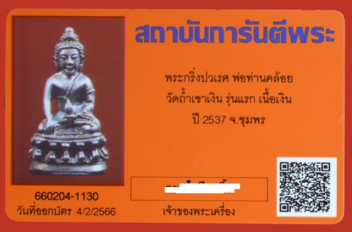 พระกริ่งปวเรศเขาเงิน เนื้อเงิน รุ่นแรก พ่อท่านคล้อย วัดถ้ำเขาเงิน จ.ชุมพร สร้างปี 2537 สร้างขึ้นเพื่อหารายได้สมทบทุนสร้างตึก "ฐานธมโม"โรงพยาบาลหลังสวน (สร้าง 1,000 องค์) พร้อมบัตรรับรองครับ