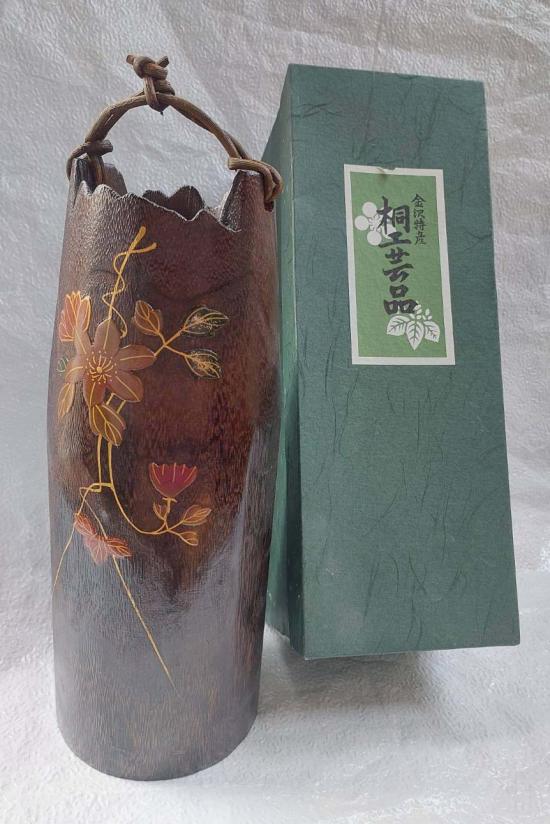 แจกันไม้ธรรมชาติ ต้นจักรพรรดินี (Empress Tree) เป็นงานฝีมือจากคานาซาวะ เพ็นลายทอง หูร้อยด้วยหวาย สวยๆ สูง 13 นิ้ว กว้าง 5 นิ้ว