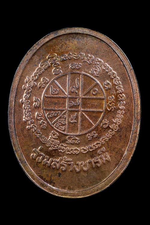 เหรียญรูปไข่นั่งสมาธิข้างพัดยศ รุ่น ร่วมสร้างบารมี ( เนื้อนวโลหะขัดเงา อยู่ในชุดทองคำ ) หมายเลข 200 พ.ศ.2536 ( กล่องเดิม )