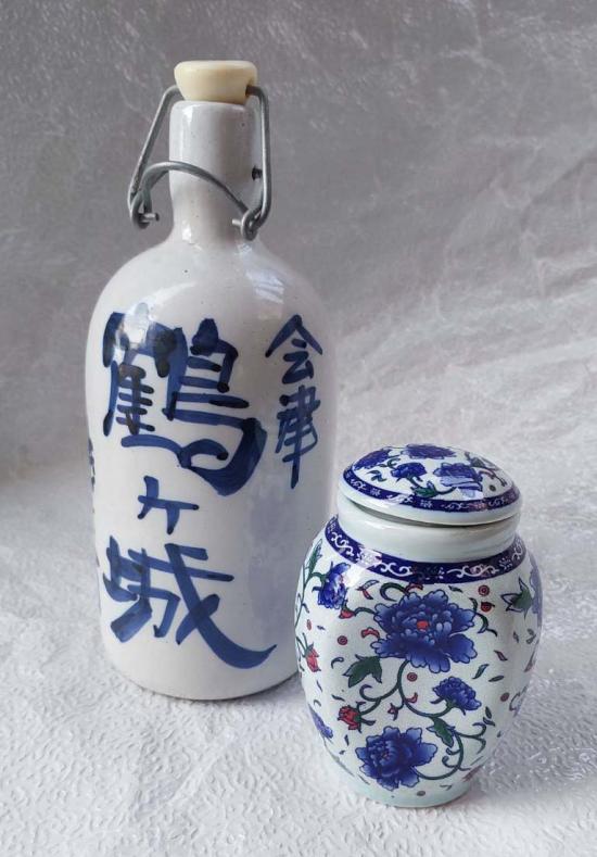 โถกับขวด กระเบื้องวินเทจมีฝาปิด ของสะสม