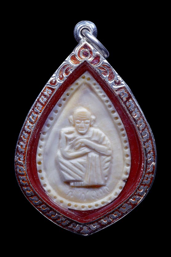 รูปเหมือนนั่งยองเนื้องาแกะสลัก ( พิมพ์หยดน้ำ , วัดองค์พระ 3.5x2.5 ซม. ) พ.ศ.2553 ( เลี่ยมกรอบเงิน )