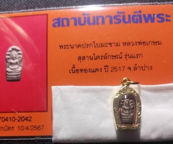 พระนาคปรกใบมะขามหลวงพ่อเกษม เขมโก สุสานไตรลักษณ์ รุ่นแรก ปี 2517 เลี่ยมทอง พร้อมบัตรรับรอง