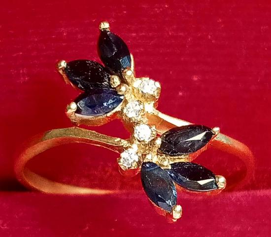 แหวนทองเหลืองขัดเงา หัวแหวนเป็นหนามเตยเกาะพลอยไพลินสีน้ำเงินเข้มเกือบดำ เพชรประดิษฐ์ ทรงดอกไม้สามกลีบไขว้ ไซซ์ประมาณ 57 วงนี้อายุหลายสิบปี สภาพตามรูป ราคาเบา ๆ ครับ แถมแหวนงานจิวเวอร์รี่ ไซซ์ประมาณ 54 ให้อีก 1 วง สุดคุ้ม ส่งฟรีทั่วไทย รับประกันตามกฎครับ