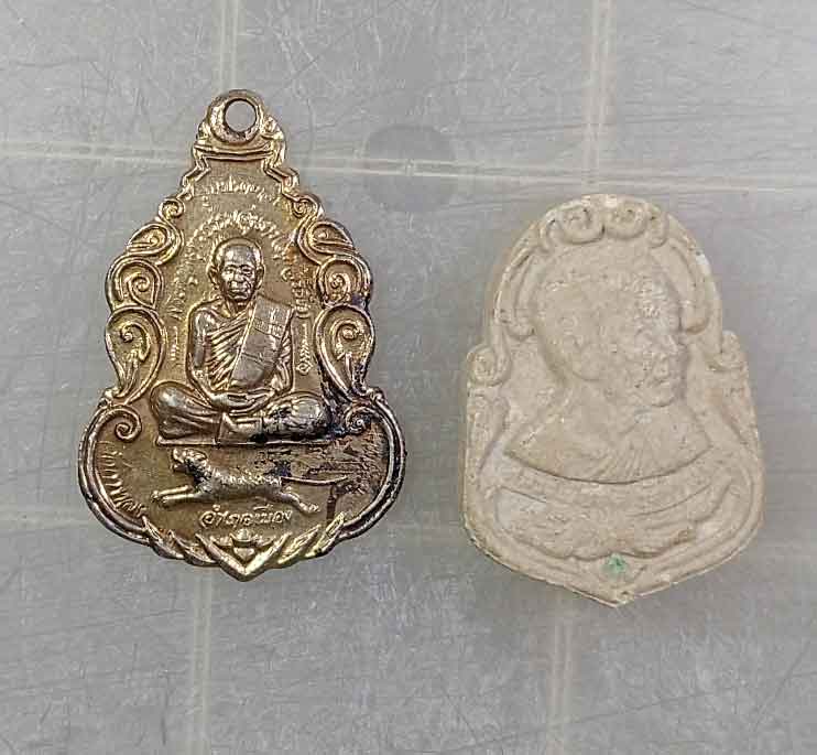 เหรียญโปรดเกล้าฯ หลวงพ่อสุด วัดกาหลง จ.สมุทรสาคร ปี 2529 กะไหล่ทอง + พระผงรูปเหมือน หลวงพ่อสุด วัดกาหลง ออกวัดนาขวาง สมุทรสาคร ปี 2542 |