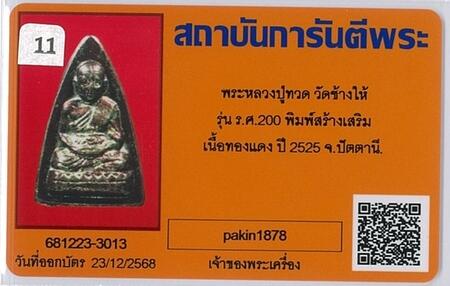 พระหลวงปู่ทวด วัดช้างไห้ ร.ศ.200 ปี 2525 ซองเดิม พร้อมบัตรรับรอง |