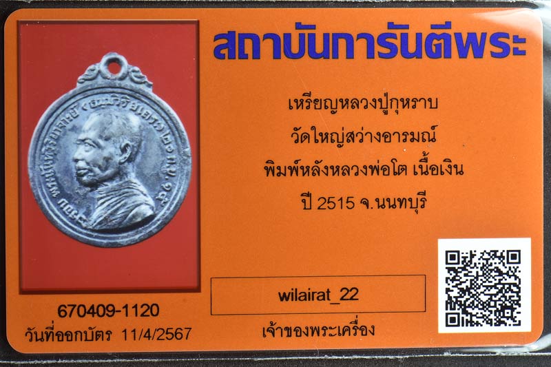 เหรียญหลวงปู่กุหลาบ หลังหลวงพ่อโต วัดใหญ่สว่างอารมณ์ เนื้อเงิน ปี15 "มีจาร" พร้อมบัตรรับรอง |