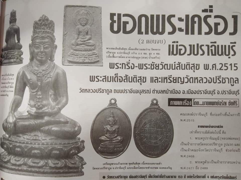 พระผงสมเด็จสันติสุข วัดหลวงปรีชากูล จ.ปราจีนบุรี ปี 2515 ของดีที่ไม่ควรมองข้าม เกจิคณาจารย์ชื่อดังจากทั่วประเทศ 259 รูป ร่วมปลุกเสก 5 วัน 5 คืน มวลสารจัดสร้างมีว่าน 200 ชนิด, ผงสมเด็จวัดระฆัง, ผงสมเด็จบางขุนพรม, ผงสมเด็จวัดเกศไชโย และพระเนื้อดินกำแพงเพชร ที่แตกหักชำรุด ปลุกเสกโดยเกจิคณาจารย์จำนวนมาก อาทิ