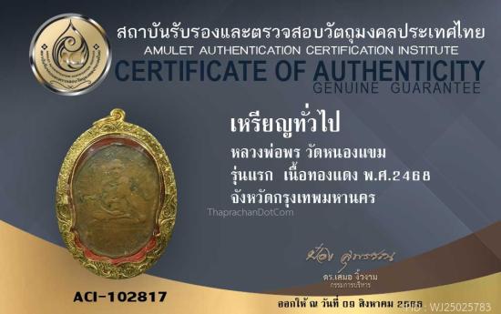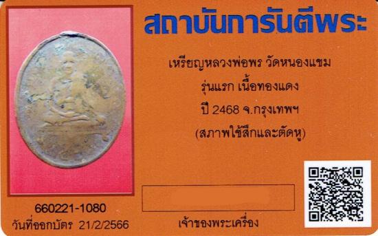 เหรียญรุ่นแรกหลวงพ่อพร วัดหนองแขม ปี2468 พร้อมบัตรรับรอง2สถาบัน