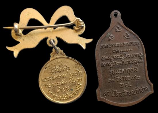 พร้อมกันทีเดียว 2 เหรียญครับ หายากสุดๆครับ เนื้อกะไหล่ทอง มีโบว์ครบชุด เหรียญ พระพุทธนิรโคคันตราย ชัยวัฒน์ จตุรทิศ (หลวงพ่อดำ) ด้านหลัง มั่ง มี ศรี สุข + เหรียญ หลวงพ่อเกษม องค์การอาหารและยา