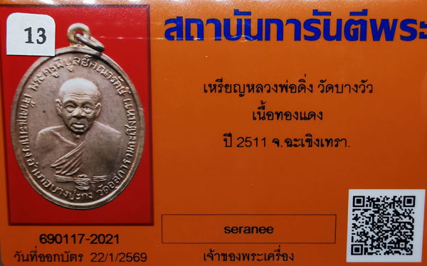 เหรียญหลวงพ่อดิ่ง วัดบางวัว เนื้อทองแดงผิวไฟ ห่วงเดิม ปี2511 จ.ฉะเชิงเทรา + บัตรG-pra สภาพเดิมค่ะ สภาพตามรูปทุกประการค่ะ