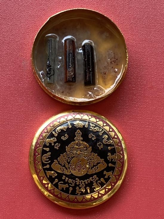 เคาะเดียวแดง สีผึ้งพระราหู รุ่น มงคลจักรวาล เนื้อ โลหะชุบทองลงยาสีดำขอบสีแดง ขนาด5ซม |