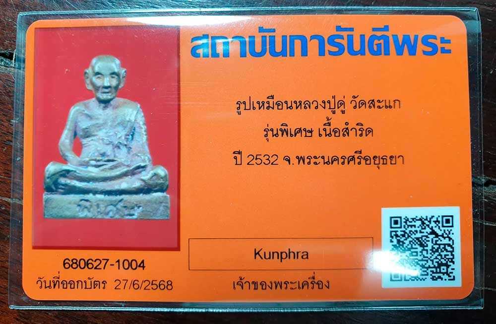 รูปหล่อลอยองค์ หลวงปู่ดู่ วัดสะแก รุ่นพิเศษ เนื้อสำริด (โลหะผสม) มีจาร มาพร้อมบัตรจี เคาะเดียวแดง 5,000 บาท