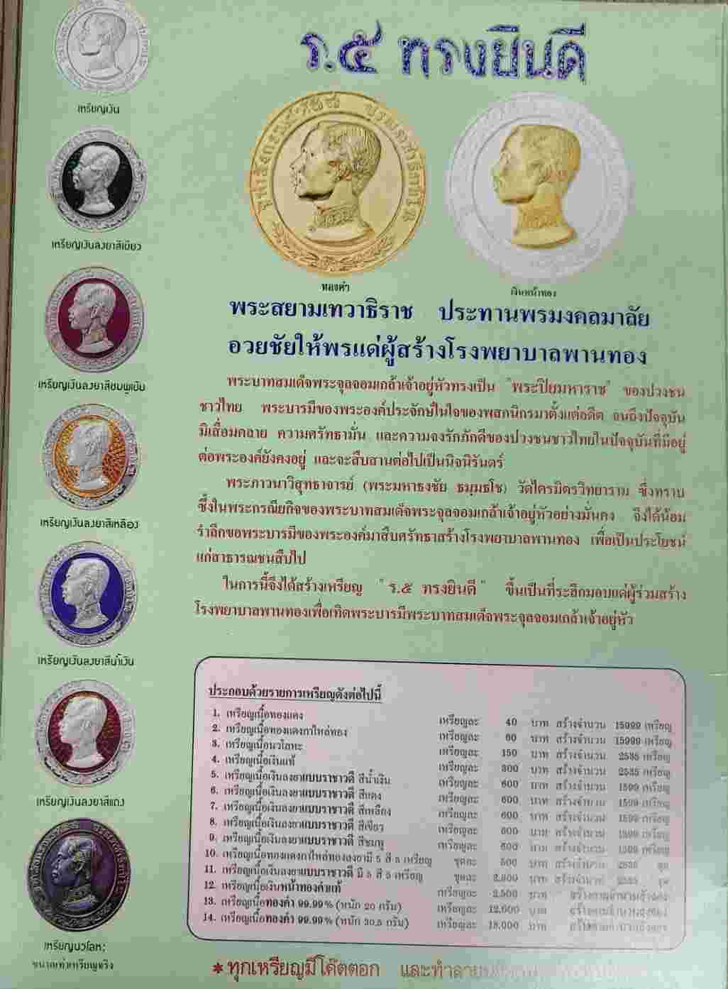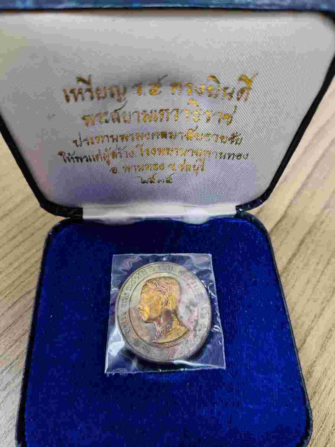 เหรียญ ร.5 ทรงยินดี พระสยามเทวาธิราช เนื้อเงินหน้าทองคำแท้ สร้างโรงพยาบาลพานทอง ปี 2535 (กล่องเดิม)