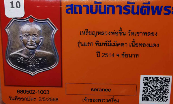 เหรียญหลวงพ่อชื้น วัดเขาพลอง รุ่นแรก พิมพ์มีเม็ดตา เนื้อทองแดง ปี2514 จ.ชัยนาท + บัตรG-pra สภาพเดิมค่ะ