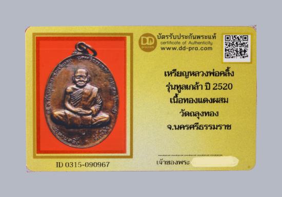 เหรียญหลวงพ่อคลิ้ง รุ่นทูลเกล้า ปี 2520 เนื้อทองแดงผสม วัดถลุงทอง จ.นครศรีธรรมราช น่าบูชามากๆค่ะ+บัตร